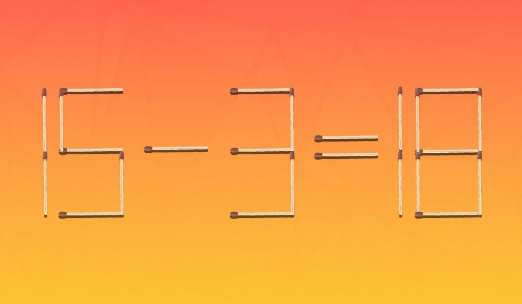 Pred sebou máte nesprávnu matematickú rovnicu 15 – 3 = 18, ktorá sa skladá z 24 zápaliek. Úlohou je zmeniť príklad tak, aby sa stal logicky správnym presunutím iba jednej zápalky. Na to sa musíte sústrediť a pozrieť sa na čísla z iného uhla.