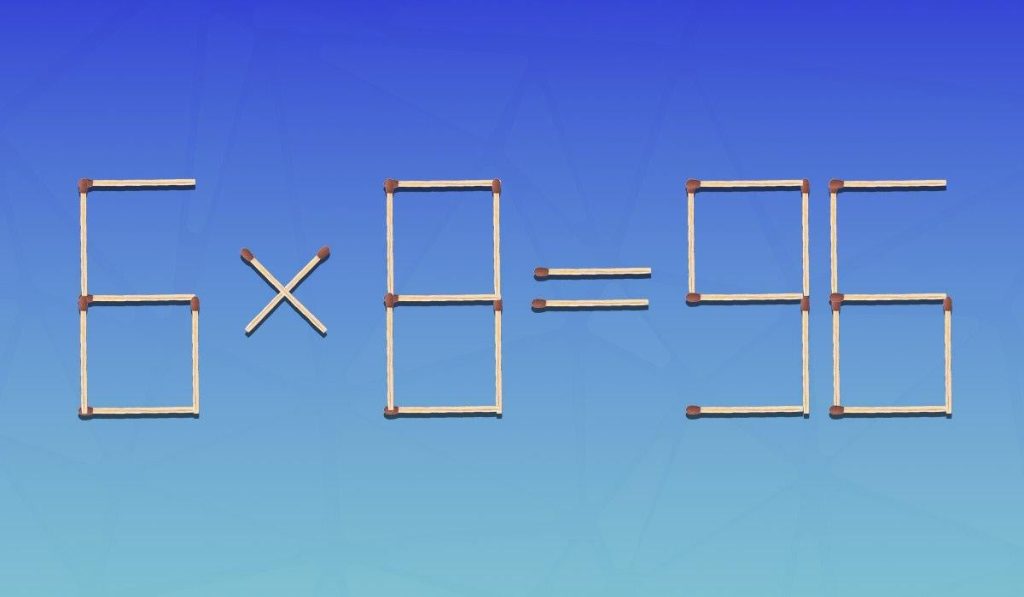 Nižšie teda uvidíte obrázok, na ktorom je rovnosť 6×8=96 zložená zo zápaliek. Na jej vytvorenie sme použili 29 zápaliek. Je zrejmé, že z matematického hľadiska táto rovnosť nie je správna.