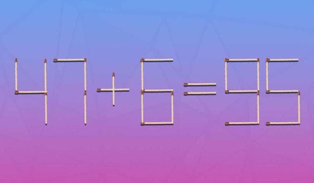 Vytvorili sme teda obrázok, na ktorom sú zápalky rozložené rovnosťou 47+6=95. Je zrejmé, že tu niečo nie je v poriadku, pretože odpoveď by mala byť 53.
