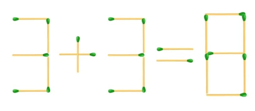 Pred očami mám nesprávnu rovnosť zloženú zo zápaliek: 3+3=8. Zdá sa, že je takmer nemožné ju opraviť, ak sa nedá nič odstrániť ani pridať. Riešenie však existuje a vôbec nie je zrejmé.