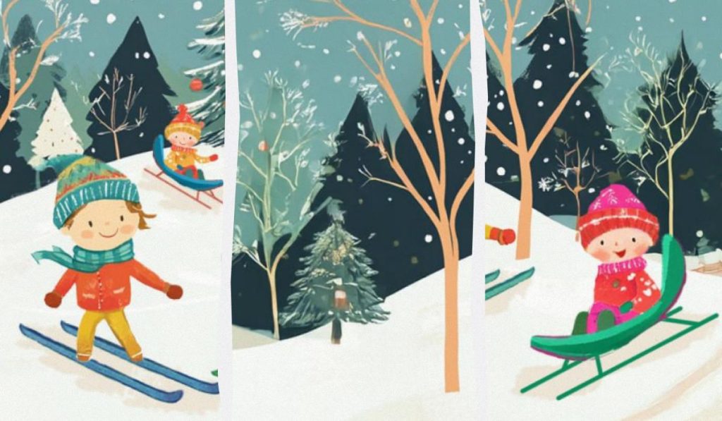 Pred vami je partia šťastných detí, ktoré si v lese užívajú sneh a pravé zimné počasie. Tie najmenšie sa sánkujú a ich starší kamaráti lyžujú.