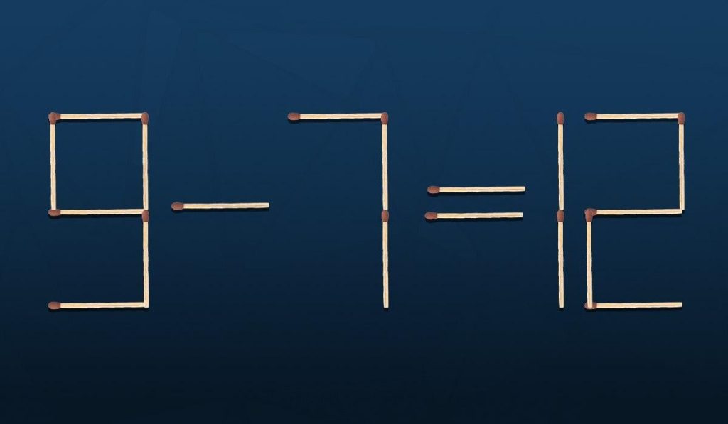Nižšie vidíte obrázok, na ktorom boli zápalky použité na vytvorenie rovnosti 9-7=12. Celkovo bolo použitých 19 zápaliek.